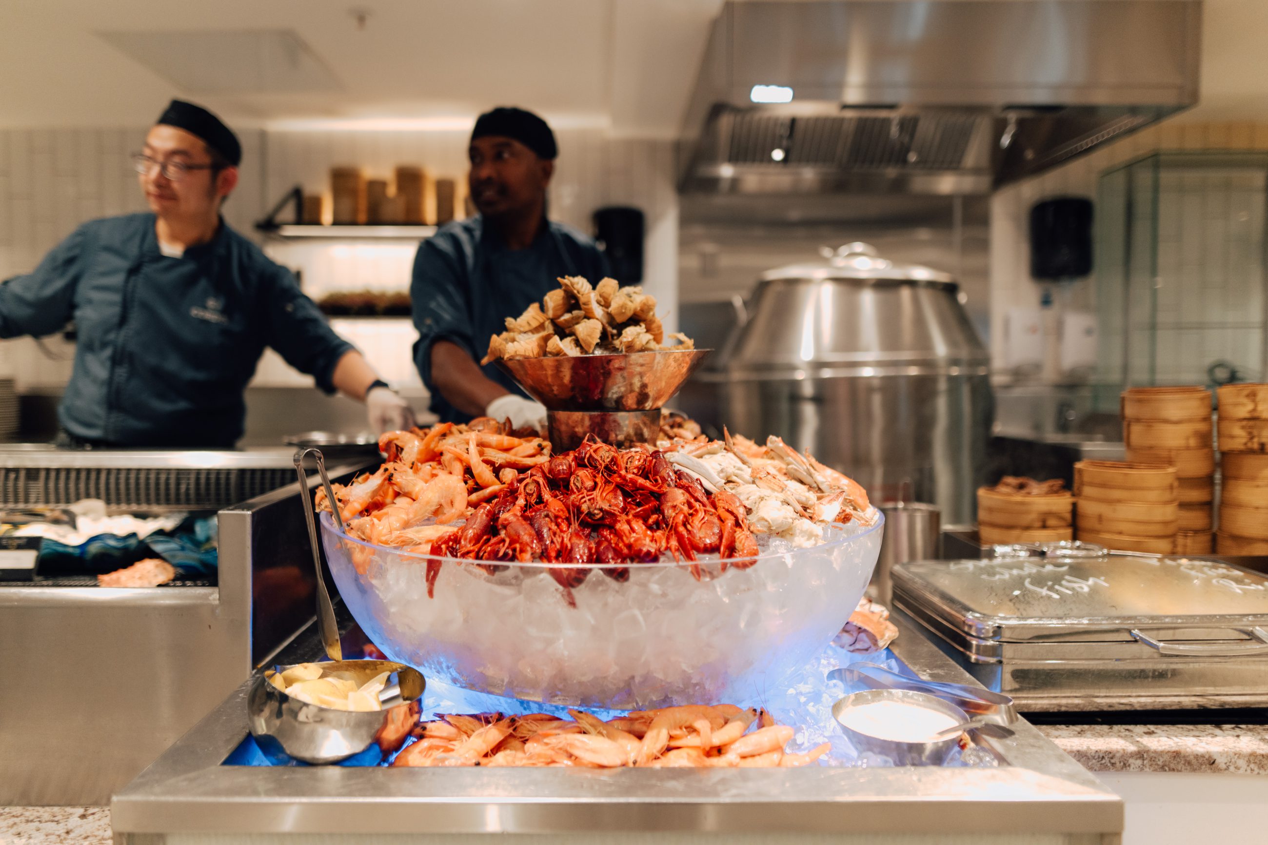You can enjoy a wider selection of foods at dinner, including specialty meats and seafood, crispy roast meat from the rotisserie, mouthwatering smoky meats and veges from a traditional American wood fired grill, delicious pizzas… plus more which are not available at lunch.